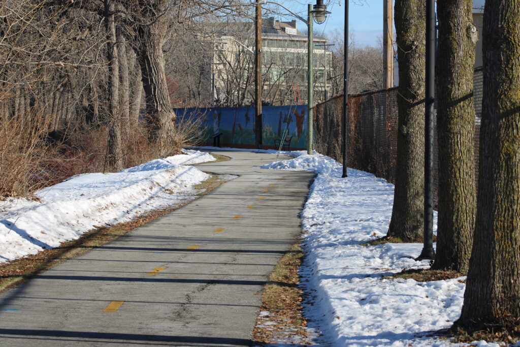 About the halfway point a sidewalk starts on the east side of the street. But the controlled cross walk for the final bridge which only has an east side cross walk was after this unplowed section.