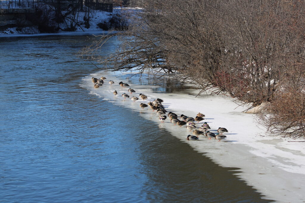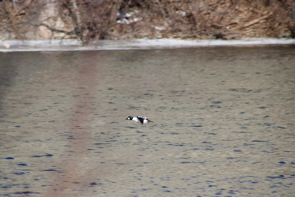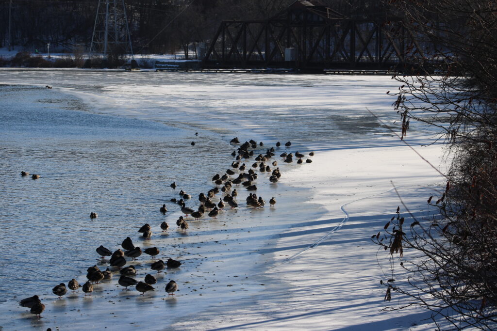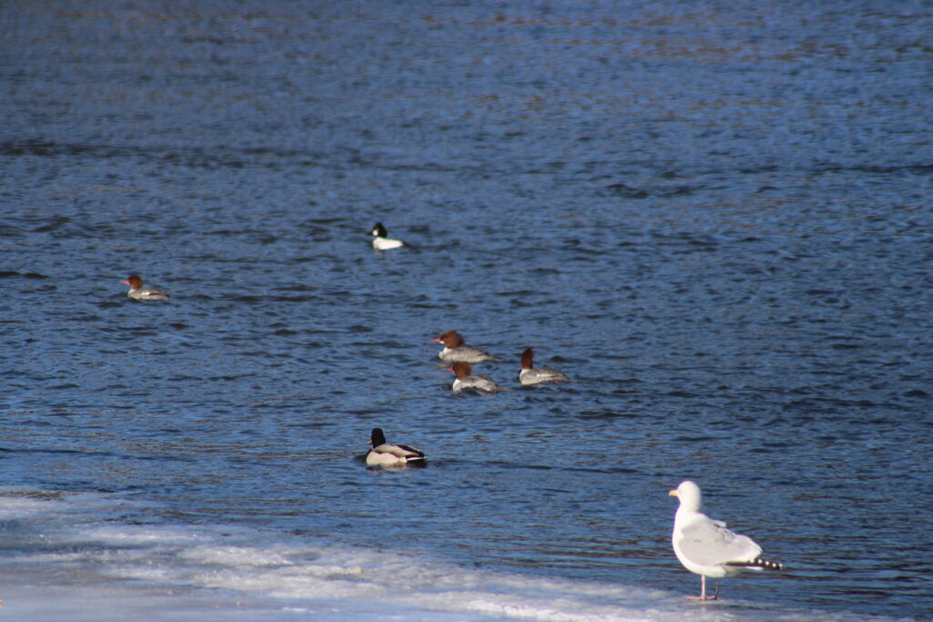 Ducks were lined up on the ice at the edge of the river and swimming up and down. Walking across the bridge gave me the opportunity to take more pictures and get a photo of the Common Merganser that I missed earlier in the hike.