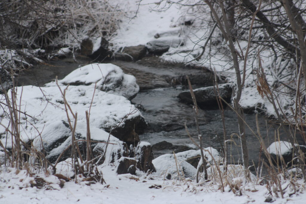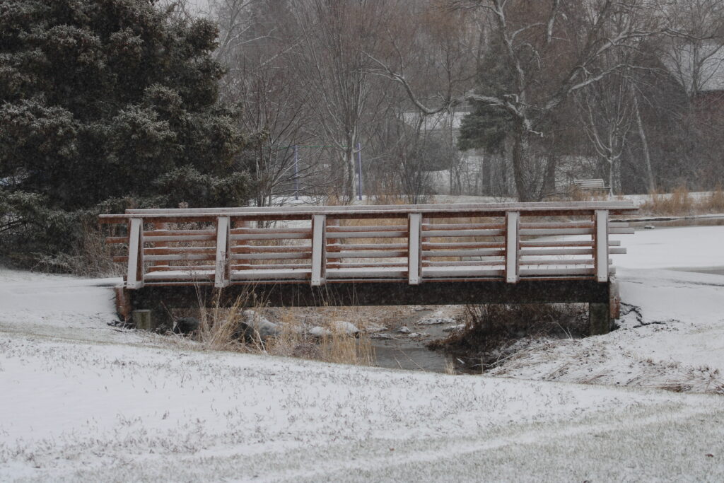 We started at the park as we planned. Taking pictures of the bridge over the stream and other land marks. With the snow blowing we used an umbrella and a waterproof hiking pouch to protect the camera.