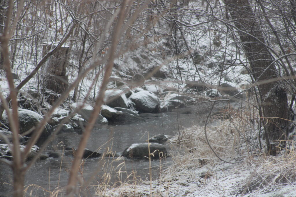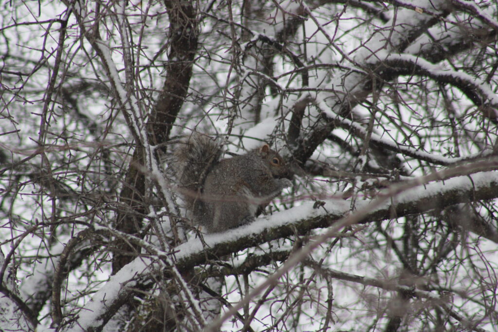 My wife wondered about the wildlife we would see. I doubted we would see many birds with the blowing snow. But as we reached the gravel path behind the community garden I caught a picture of a squirrel. He hunkered down in the small trees between the park and an apartment complex.